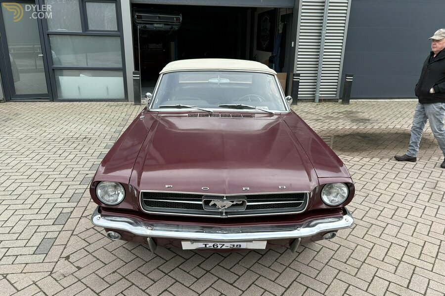 Este Ford Mustang descapotable de 1965, con matrícula holandesa, permaneció almacenado durante 33 años hasta 2020. Presenta un acabado en color «Vintage Burgundy» con interior negro y está equipado con un motor de 6 cilindros y 200 pulgadas cúbicas, acoplado a una caja de cambios manual de 3 velocidades. Los frenos de tambor han sido revisados y el coche cuenta con tapacubos de radios, una capota blanda blanca con dos desgarros en la ventana de vinilo y una radio de estilo retro. El coche no está perfecto estéticamente, pero tiene un maravilloso aspecto clásico. Las llantas de acero de 14 pulgadas están equipadas con tapacubos y neumáticos con banda blanca. El coche tiene tapicería negra en los asientos envolventes y se ha instalado una radio de estilo retro. El coche cuenta con aire acondicionado instalado por el concesionario, pero no funciona. El cuadro de instrumentos consta de un velocímetro de 193 km/h, flanqueado por indicadores del nivel de combustible y la temperatura del refrigerante. El cuentakilómetros de cinco dígitos marca 46 158 millas. El motor de 6 cilindros y 200 pulgadas cúbicas tenía una potencia de fábrica de 120 CV, transmitida a las ruedas traseras a través de una transmisión manual de 3 velocidades y un eje trasero con una relación de transmisión de 3,20:1. En los últimos cinco años se han sustituido el radiador, el embrague, el distribuidor, los puntos de contacto, el escape y la bomba de combustible. Sustituciones recientes: latiguillos de freno, frenos traseros, rótulas y tirantes. Homologado por RDW el 13-02-2026